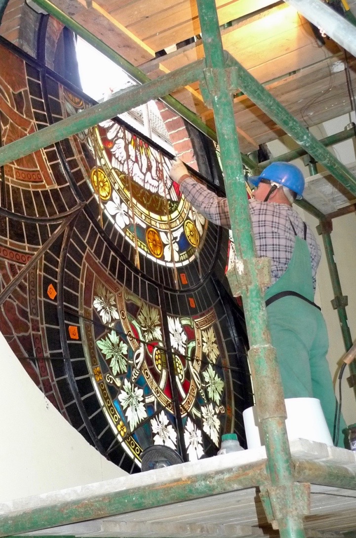 17 kwietnia 2019 r. podczas prac renowacyjnych rozety natrafiono na elementy pobrane z innych zabytkowych witraży.